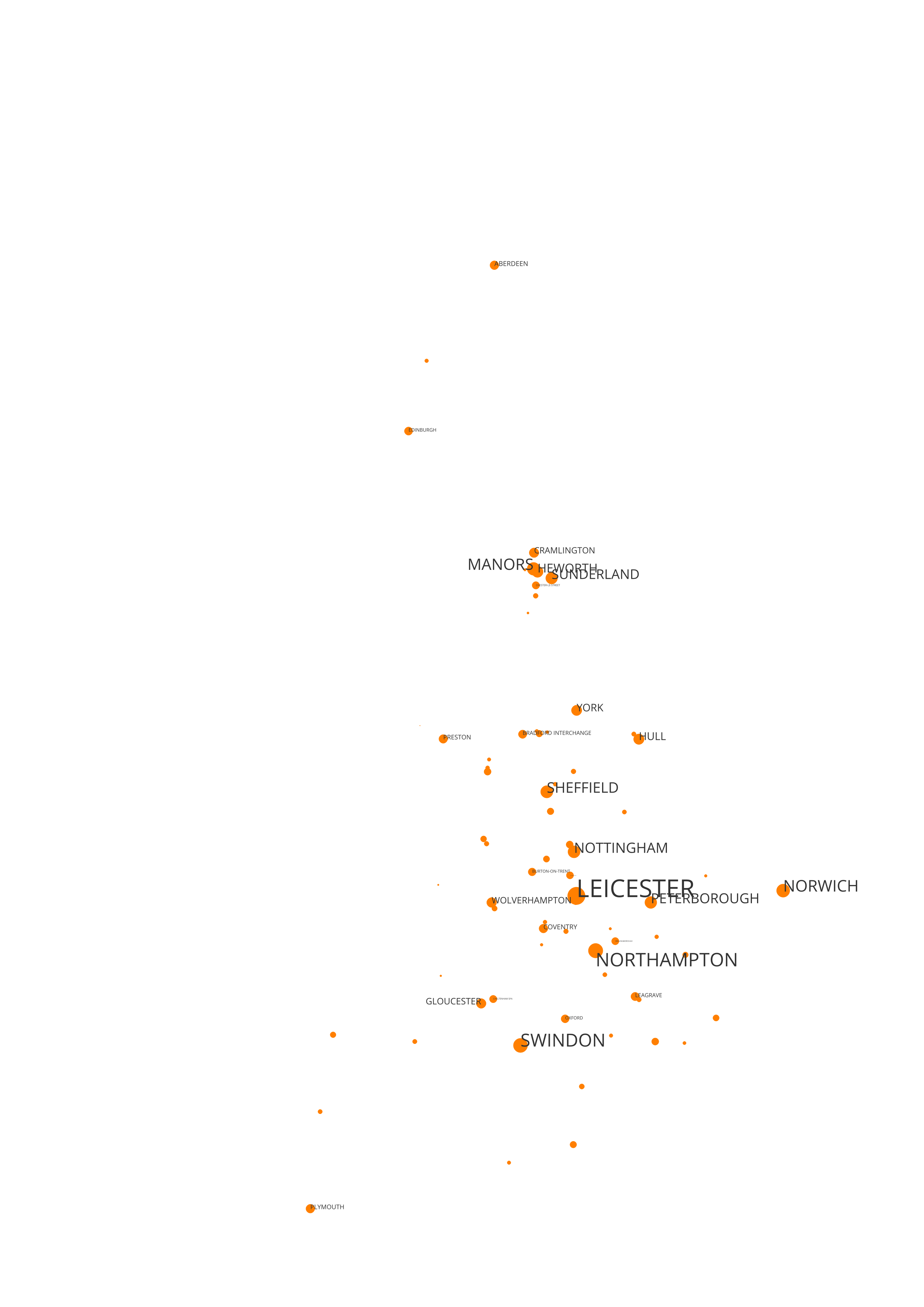 For the twenty sixth #30MapsInAMonth is a visualisation using the Office of Rail and Road (ORR) Financial Year 2018/19 to 2023/24 passenger travel data projected onto a Network Rail shortest-path network using the centre-line track-model to create visualisation for passenger journey numbers for the active rail stations across the British rail network.